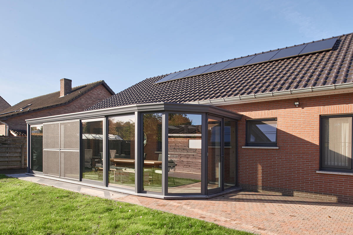 Deze elegante veranda in Olen sluit mooi aan op de bestaande woning. De constructie heeft een lessenaarsdak dat in een waaiervorm uitloopt. De dakgoot loopt volledig door, waardoor het geheel één duidelijke lijn vormt. Dat geeft de veranda een rustige en strakke uitstraling.